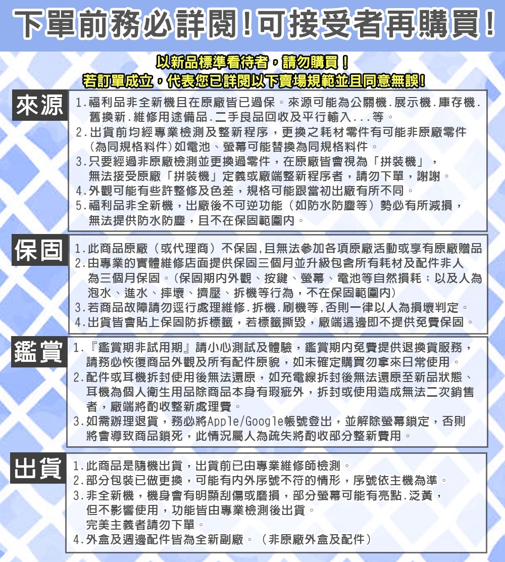 | 備註 | ★本賣場商品外觀均為8成新以上,會有較明顯刮傷及使用痕跡,介意者請勿購買。★本賣場螢幕部分會有些微老化烙印、泛黃、亮點、黑點,不影響螢幕使用,如介意者請勿購買,謝謝。★此商品僅支援WiFi上網,無法撥打電話及插卡上網。★三星手機/平板可能會因為版本不同,CPU會有所差異★本賣場商品均無附SPEN觸控筆等配件,如需此配件均需請客額外另購,謝謝。★商品與軟體兼容不在保固範圍,如有特殊APP需求請於鑑賞期內確認,如逾鑑賞期則無法因此問題退貨,謝謝。 |