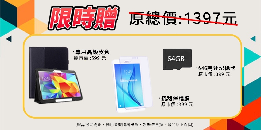 | 贈品 | 贈耐磨抗刮鋼化膜+專用掀蓋保護皮套+64G記憶卡 (贈品送完為止,顏色、樣式均隨機贈送,恕無法更換,贈品恕不保固) |