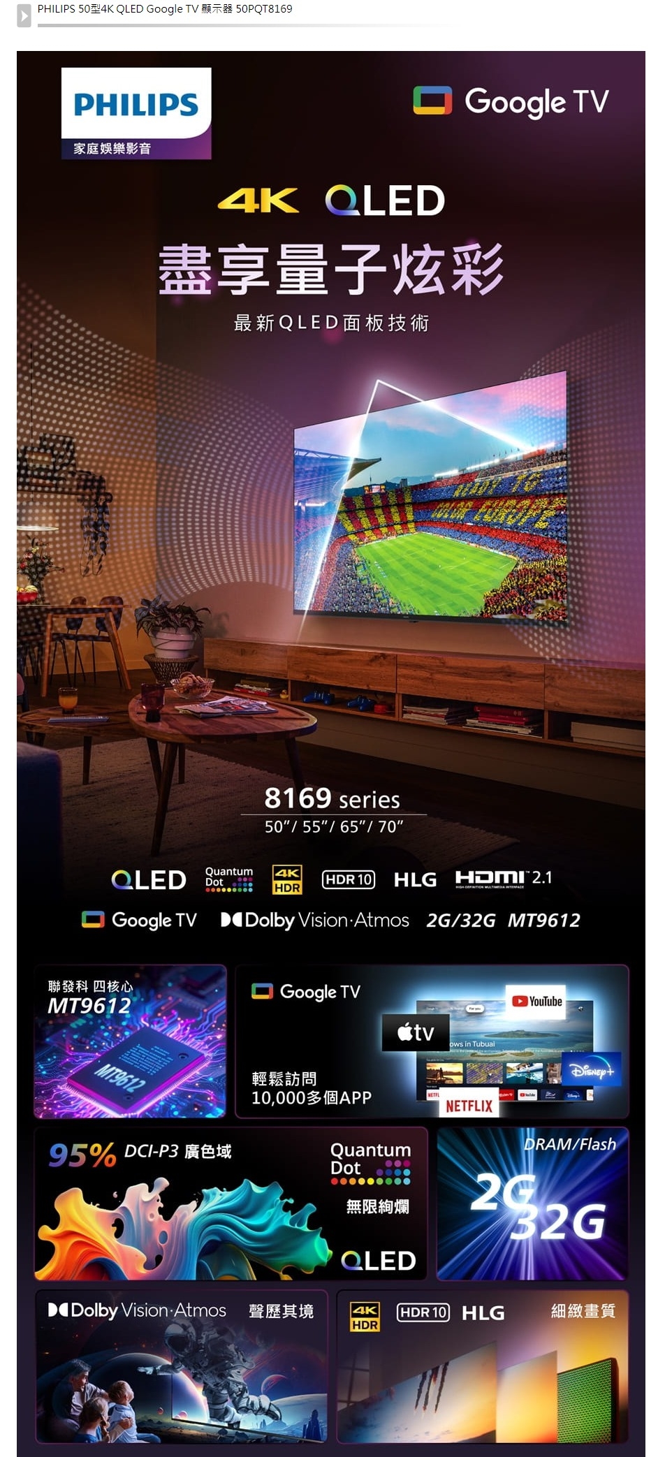 | 商品名稱 | PHILIPS 50型4K QLED Google TV 顯示器 50PQT8169 |