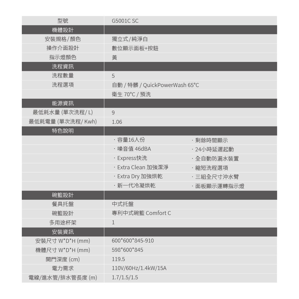 Miele G5001SC 獨立式份洗碗機110V/60Hz(獨立16人份洗碗機/110V電壓/總代理直營)