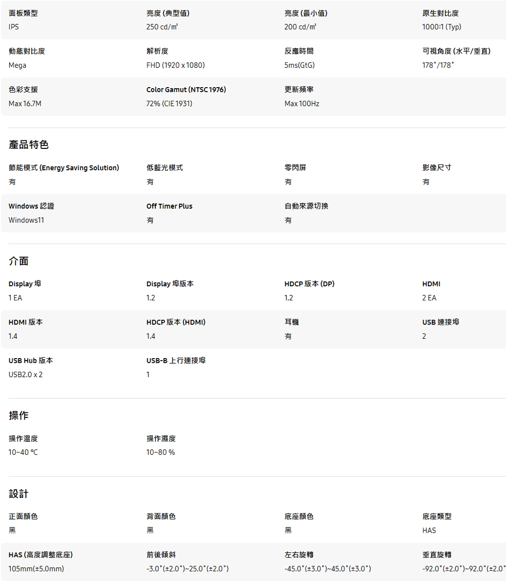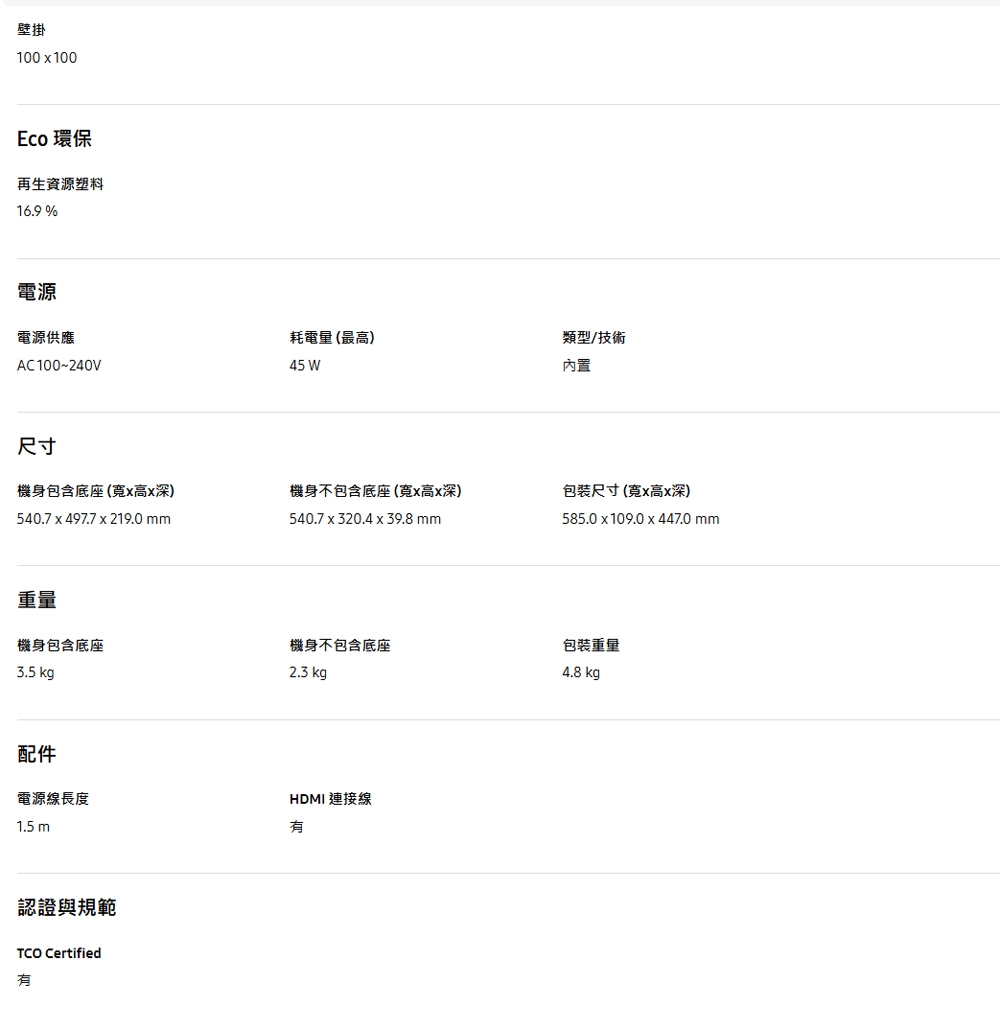 | 特殊功能 | 抗藍光, 護眼, 零閃屏, 廣視角, 超薄機身, 節能, 窄邊框 |