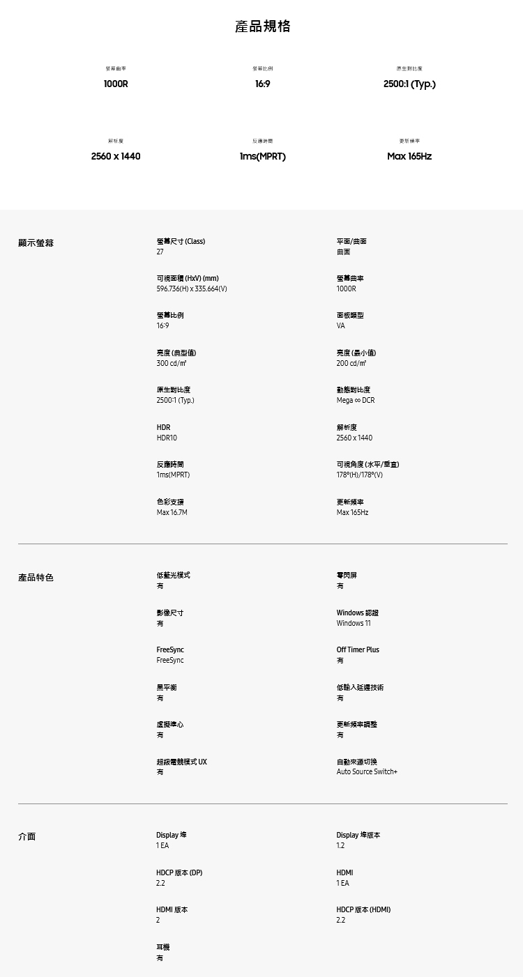 | 特殊功能 | 曲面,抗藍光,零閃屏,廣視角,護眼不閃屏,可壁掛式 |
