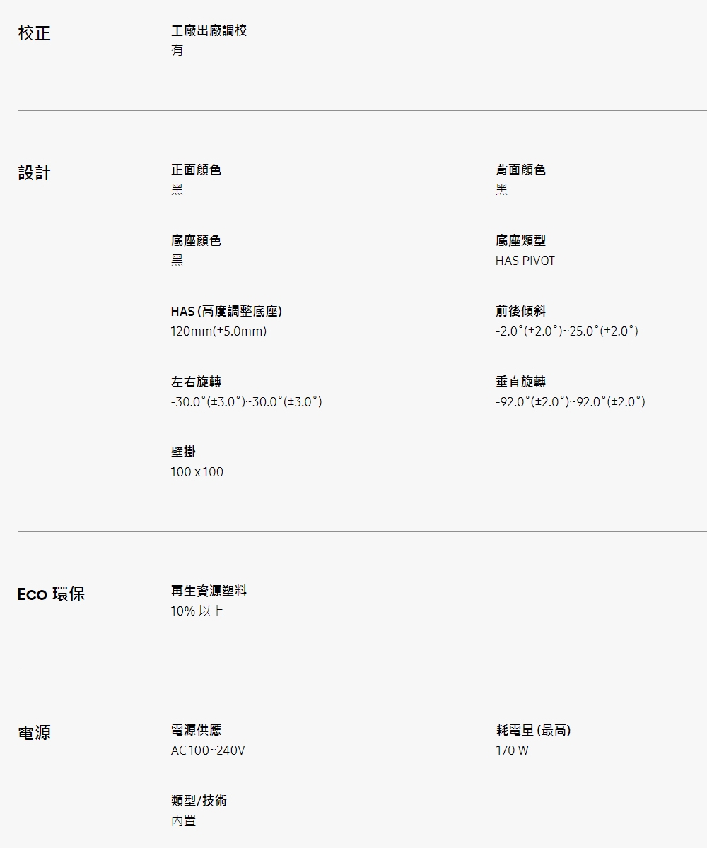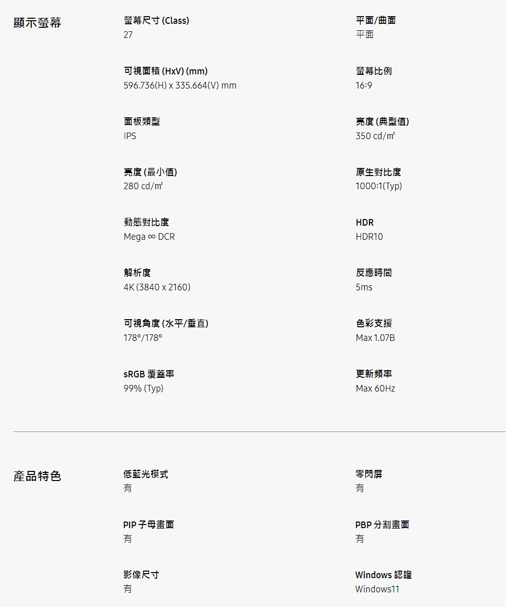 | 特殊功能 | 零閃屏, 抗藍光, 90度樞軸旋轉, 左右旋轉, 窄邊框, 4K |