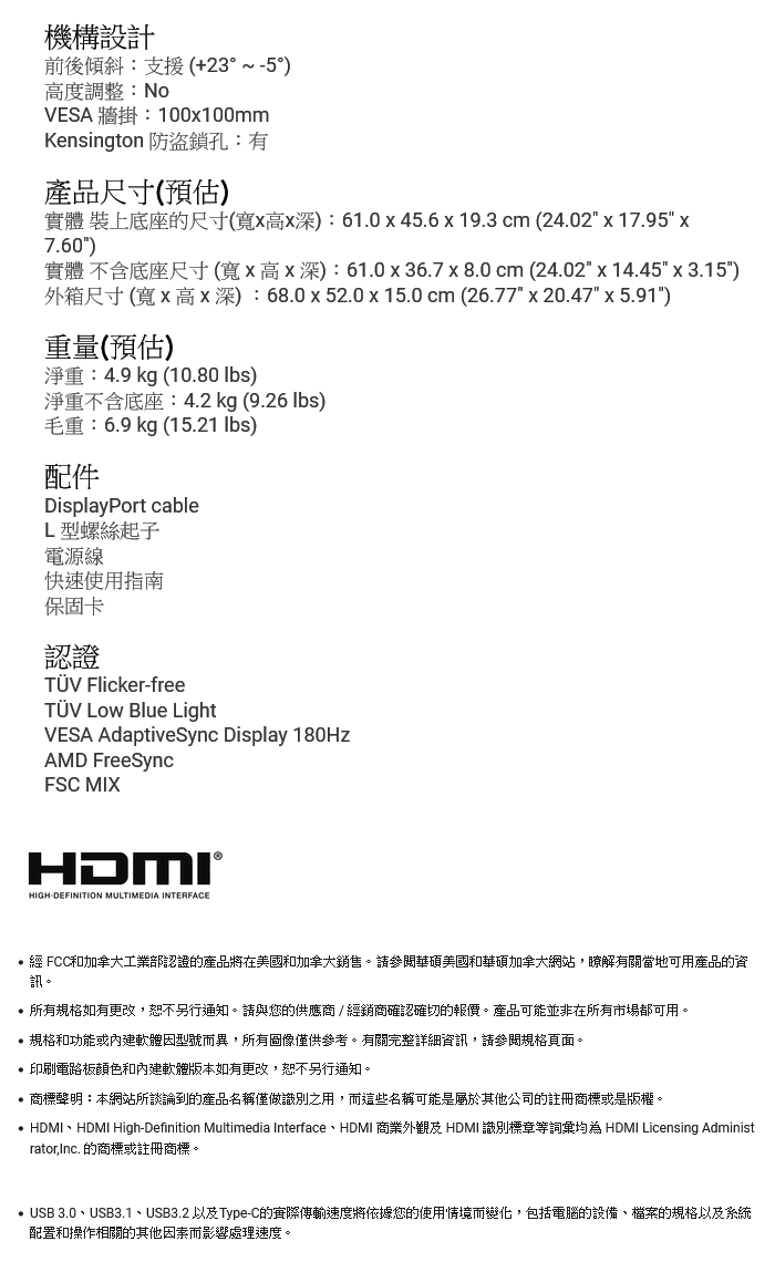 | 包裝內容 | DP 線 / L 型螺絲起子 / 電源線 / 快速入門手冊 |