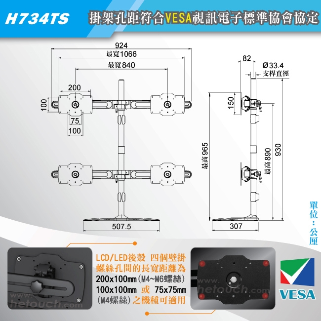 | VESA安裝孔位 | 200 x 100 / 100 x 100 / 75 x 75 公厘適用 |
