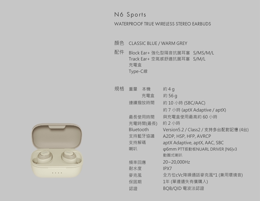 Nuarl N6sports 藍芽耳機,採用先進藍芽5.2 技術,提供穩定無線連線與優異音質。入耳式設計舒適貼合,內建麥克風支援通話,輕量僅0.26g 適合長時間配戴。莫蘭迪杏、莫蘭迪藍兩色選擇,通用iOS/Android系統,中國製造,一年保固。NCC驗證安全可靠,完美伴侶日常運動與娛樂。
