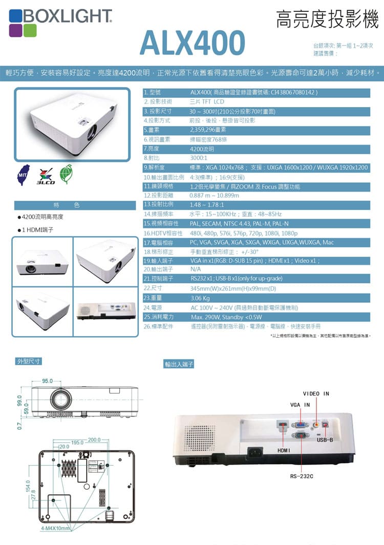 Boxlight ALX400 商務投影機,4200流明高亮度,XGA (1024x768) 解析度,支援4:3與16:9畫面比例,投影尺寸30~300吋,內建喇叭適合會議使用。白色系設計,重量僅3.06kg,投射距離0.887m~10.899m,對比度3000:1,提供清晰影像。電源100~240V,最大功率290W,一年保固,BSMI認證R45962,理想商務投影解決方案。